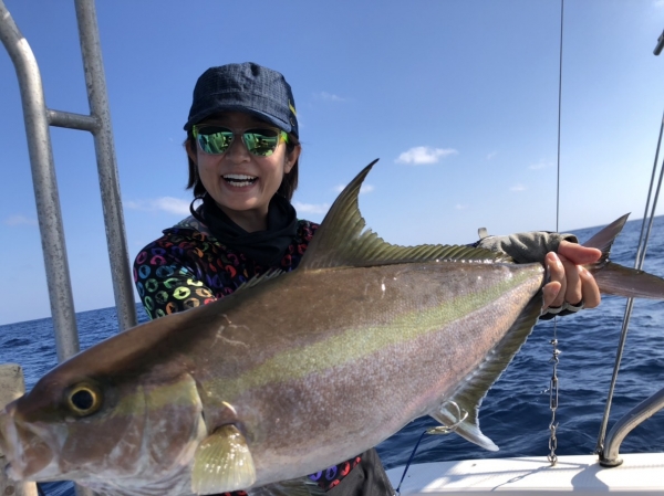 緩めに設定していたドラグからジジーーーーと、子気味のいい音がなる。気持ちいい!やけに重いと思ってたらスレがかりしたヒレナガカンパチ。