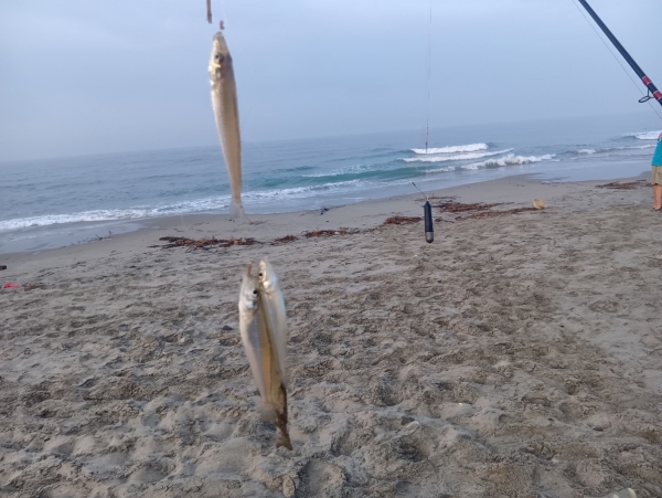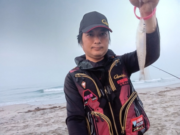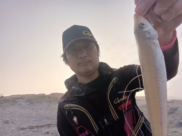 手前までさびくがアタリはない。1色切ってから急にブルブルと強烈なアタリが来た。波が来るタイミングで重りを巻き上げる。引き波が強い為、取り込みは慎重に行った。すると16センチのキスが上がってきた。続いて2色投げて1色付近から丁寧に探る。波が崩れているところで駆け上がりがあり、そこにキスが居る様子。するとまたブルブルとアタリが来た。周りはヒイラギやスズキやツバメコノシロなどの外道は釣れているがキスは釣れていない。